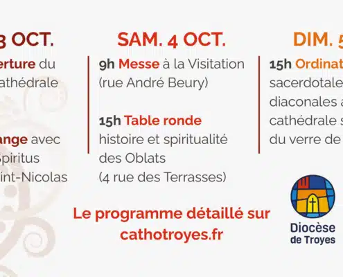 Von Freitag, 3. Oktober 2025, bis Sonntag, 5. Oktober 2025 gedenken die Oblaten des hl. Franz von Sales in Troyes, Frankreich, des 150. Todestages von Schwester Marie de Sales Chappuis OVM, der Impulsgeberin ihrer Ordensgründung, und sie feiern den 150. Jahrestag der päpstlichen Anerkennung ihrer Ordensgemeinschaft. Die Feierlichkeiten können via Youtube auch online verfolgt werden.